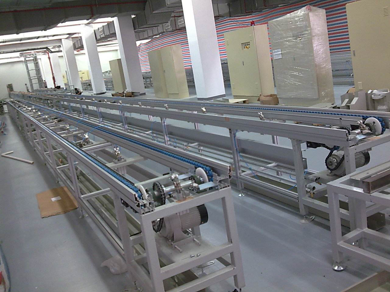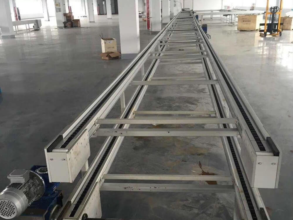 链条输送机是以链条作为牵引和承载体输送物料,链条可以采用普通的套筒滚子输送链,也可采用其它各种特种链条(如积放链,倍速链)。链条输送机的输送能力大,主要输送托盘、大型周转箱等。输送链条结构形式多样,并且有多种附件,易于实现积放输送,可用做装配生产线或作为物料的储存输送。